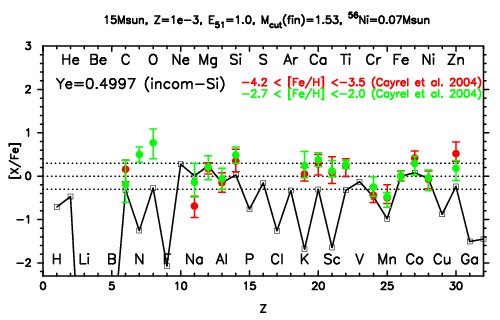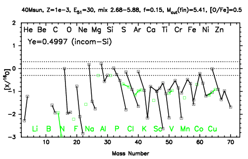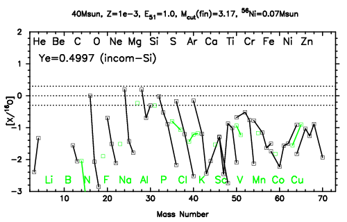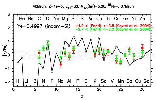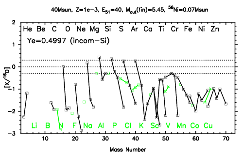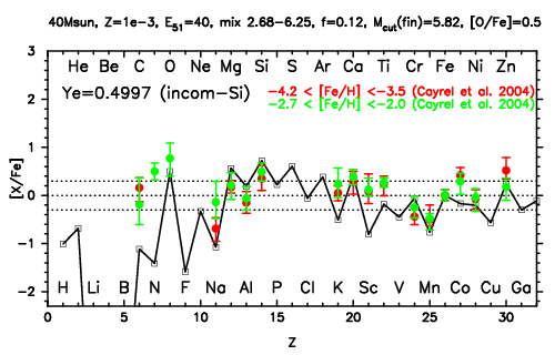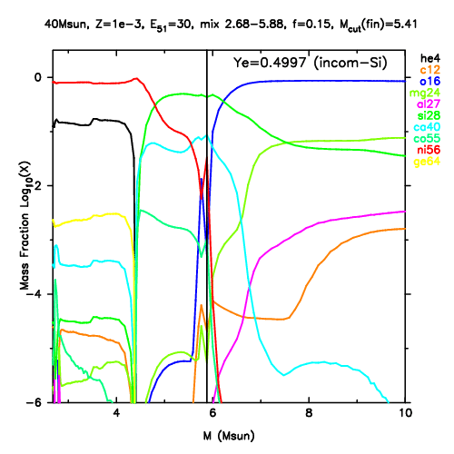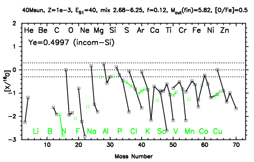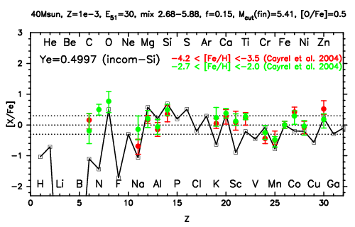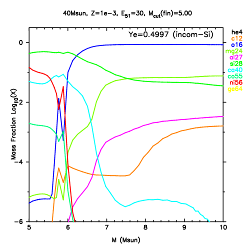 | 40M,E51=30,Z=0.001,MCfin=5.00,M(56Ni)=0.07 | 40M,E51=30,Z=0.001,MCfin=5.41 (Mixing-fallback: [O/Fe]=0.5) | ||