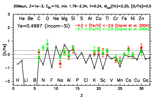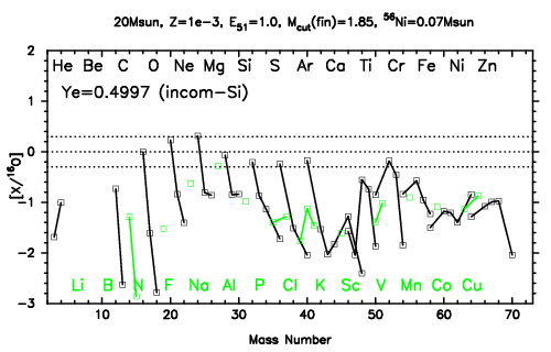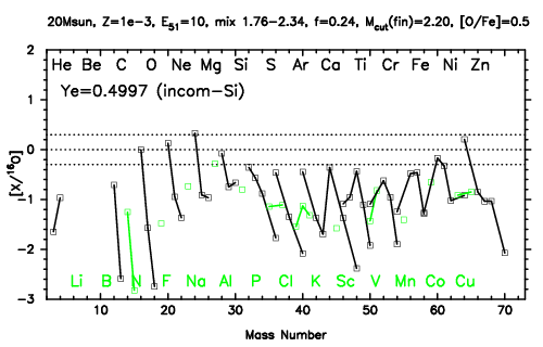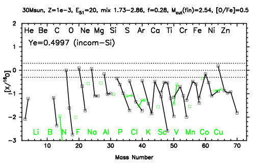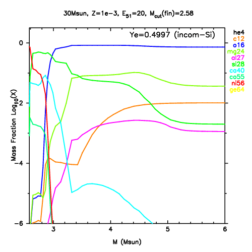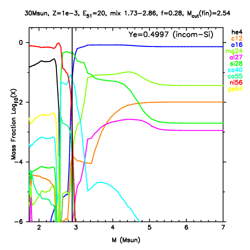 | 30M,E51=20,Z=0.001,MCfin=2.58,M(56Ni)=0.07 | 30M,E51=20,Z=0.001,MCfin=2.54 (Mixing-fallback: [O/Fe]=0.5) | ||