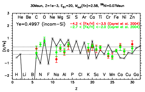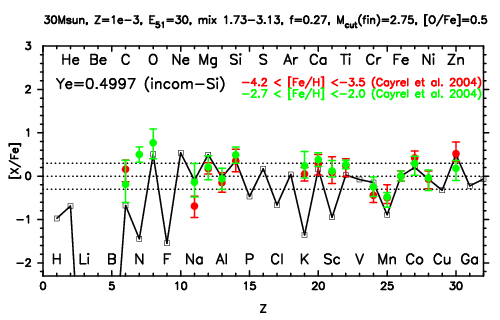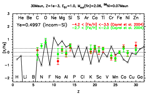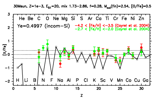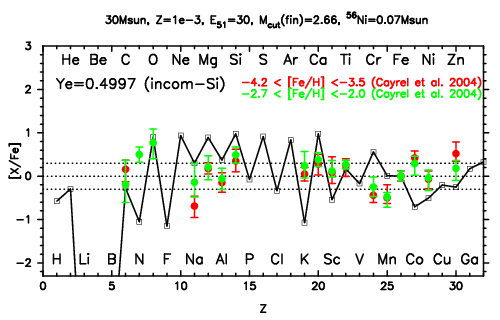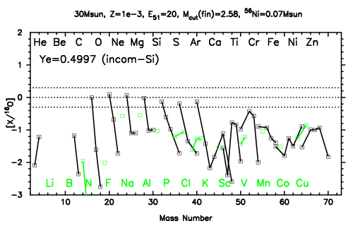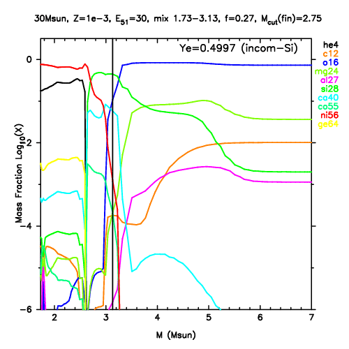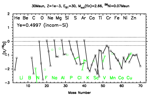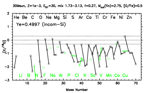 | 30M,E51=30,Z=0.001,MCfin=2.66,M(56Ni)=0.07 | 30M,E51=30,Z=0.001,MCfin=2.75 (Mixing-fallback: [O/Fe]=0.5) | ||