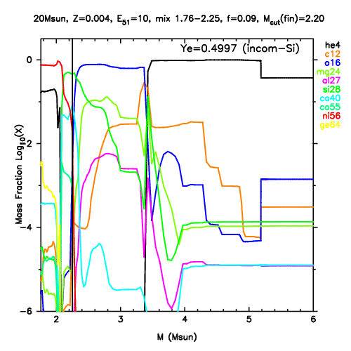 | 20M,E51=10,Z=0.004,MCfin=2.05,M(56Ni)=0.07 | 20M,E51=10,Z=0.004,MCfin=2.20 (Mixing-fallback: [O/Fe]=0.5) | ||