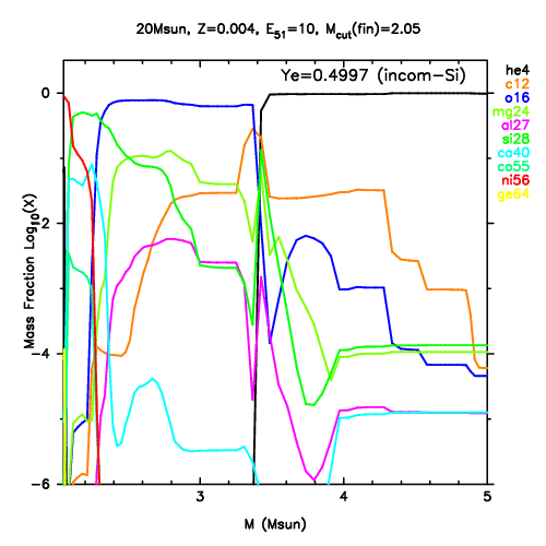 | 20M,E51=10,Z=0.004,MCfin=2.05,M(56Ni)=0.07 | 20M,E51=10,Z=0.004,MCfin=2.20 (Mixing-fallback: [O/Fe]=0.5) | ||