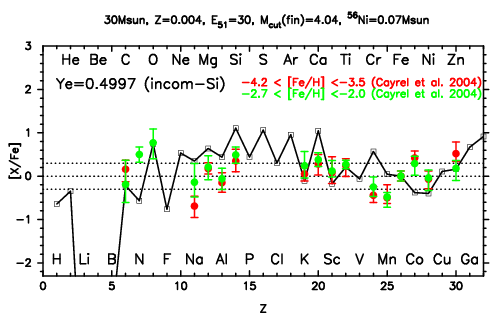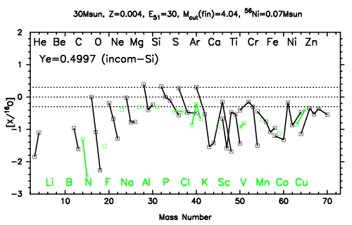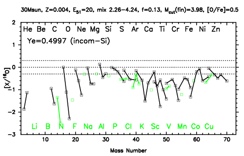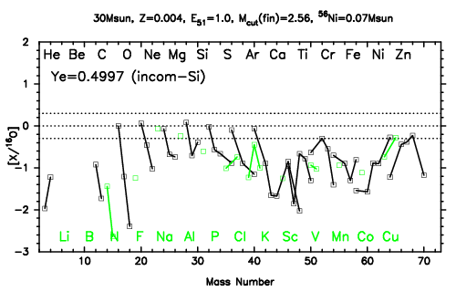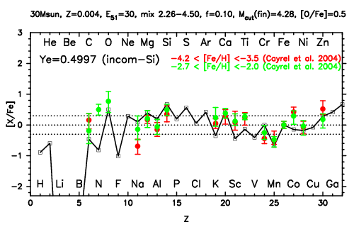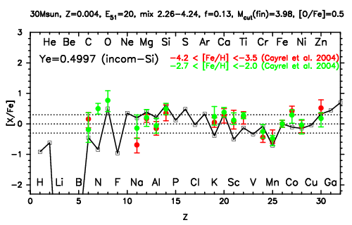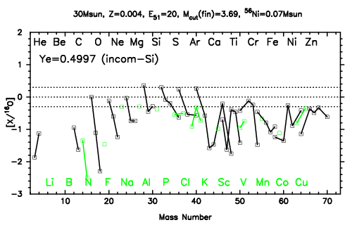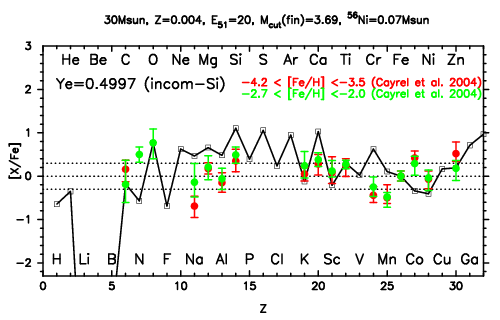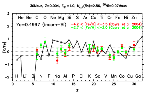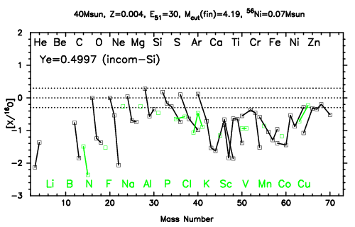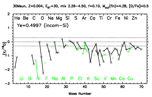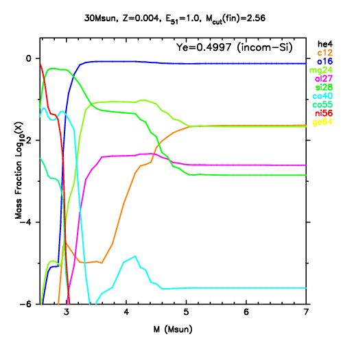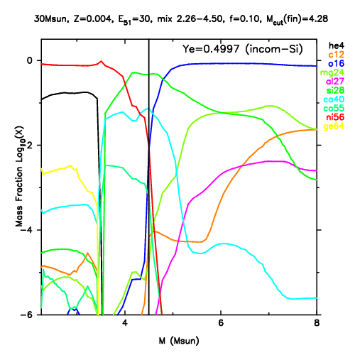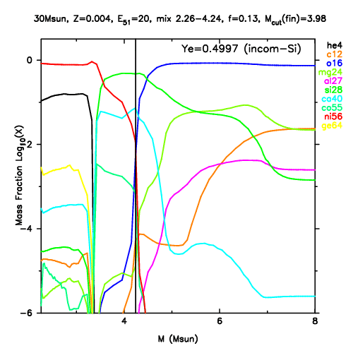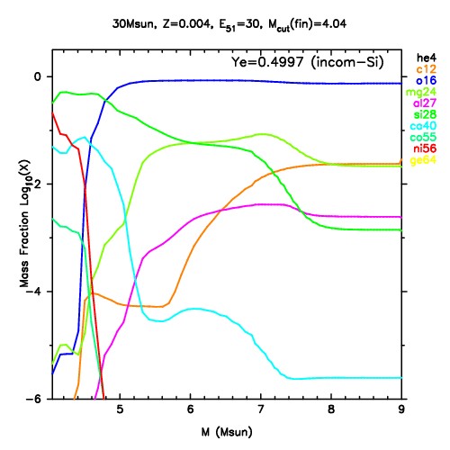 | 30M,E51=30,Z=0.004,MCfin=4.04,M(56Ni)=0.07 | 30M,E51=30,Z=0.004,MCfin=4.28 (Mixing-fallback: [O/Fe]=0.5) | ||