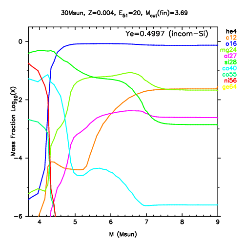 | 30M,E51=20,Z=0.004,MCfin=3.69,M(56Ni)=0.07 | 30M,E51=20,Z=0.004,MCfin=3.98 (Mixing-fallback: [O/Fe]=0.5) | ||