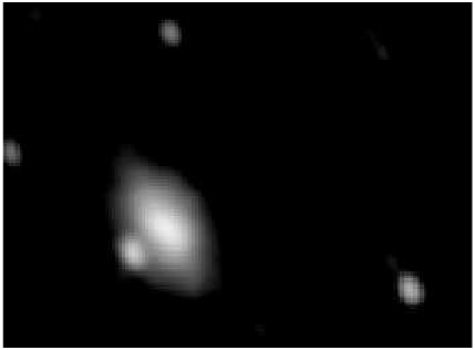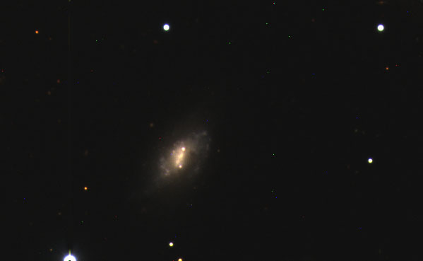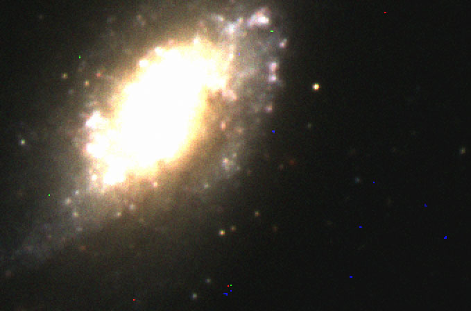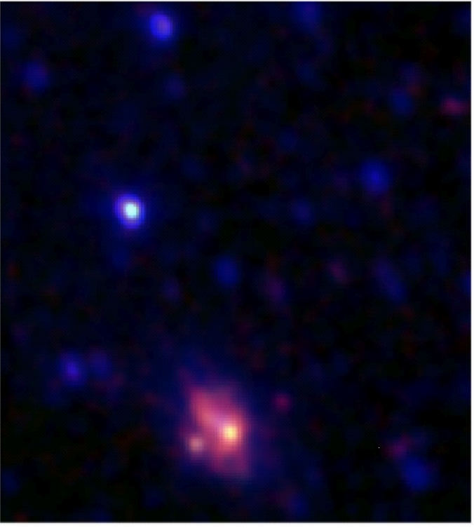 図2 「あかり」衛星に搭載されている近・中間赤外線カメラが捕らえた爆発から約半年後の超新星2006jc及び母銀河UGC4904の擬似三色合成図。3ミクロン(青)、7ミクロン(緑)、11ミクロン(赤)の撮像データより作成。一般的な恒星は青いのに対し、超新星2006jcは銀河と同じくらい赤く輝いており、終焉を迎えた超新星周囲で誕生した塵の熱放射が捉えられています。 図2 (png file) 脚注なし画像 |